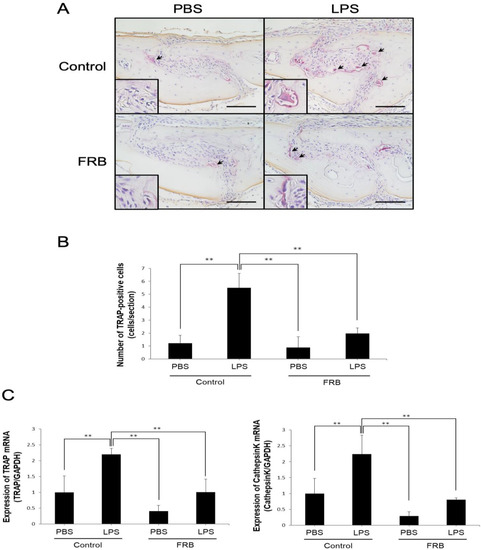 Calvaria collected from mice were immersed in TRIzol reagent (Invitrogen, Carlsbad, CA, USA), crushed and centrifuged. Total RNA was purified using the RNeasy mini kit (Qiagen, Valencia, Santa Clarita, CA, USA) for in vivo experiments. For the in vitro experiments, both macrophages and osteoblasts were treated with PBS and 0.5% DMSO, LPS (100 ng/mL) and 0.5% DMSO, LPS (100 ng/mL) and FRB extract (500 μg/mL) or PBS and FRB extract (500 μg/mL) for 3 days; then, total RNA was extracted from their samples using the RNeasy mini kit (Qiagen). cDNA was synthesized from total RNA using Superscript IV reverse transcriptase (Invitrogen). Real-time RT-PCR was performed on the Thermal Cycler Dice Real-Time system (Takara, Shiga, Japan) using TB Green Premix Ex Taq II (Takara Bio). The specific primers used in this study were as follows: GAPDH (forward: 5′-GGTGGAGCCAAAAGGGTCA-3′, reverse: 5′-GGGGGCTAAGCAGTTGGT-3′); TRAP (forward: 5′-AACTTGCGACCATTGTTA-3′, reverse: 5′-GGGGACCTTTCGTTGATGT-3′); Cathepsin K (forward: 5′-GCAGAGGTGTGTACTATGA-3′, reverse: 5′-GCAGGCGTTGTTCTTATT-3′); TNF-α (forward: 5′-CTGTAGCCCACGTCGTAGC-3′, reverse: 5′-TTGAGATCCATGCCGTTG-3′); and RANKL (forward: 5′-CCTGAGGCCCAGCCATTT-3′, reverse: 5′-CTTGGCCCAGCCTCGAT-3′). All reactions were normalized with GAPDH as a reference gene [42].