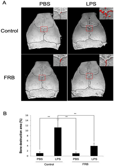 The calvaria of all mice were imaged with Micro-CT to measure the amount of bone resorption areas on the outer surface. In the control diet supplementation group, LPS administration significantly increased the ratio of bone resorption area to total area compared to PBS administration. In contrast, FRB supplementation reduced the increase in bone destruction caused by LPS administration (Figure 2A,B).