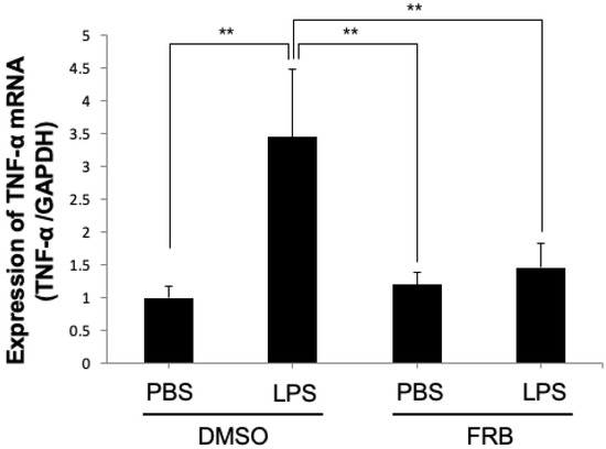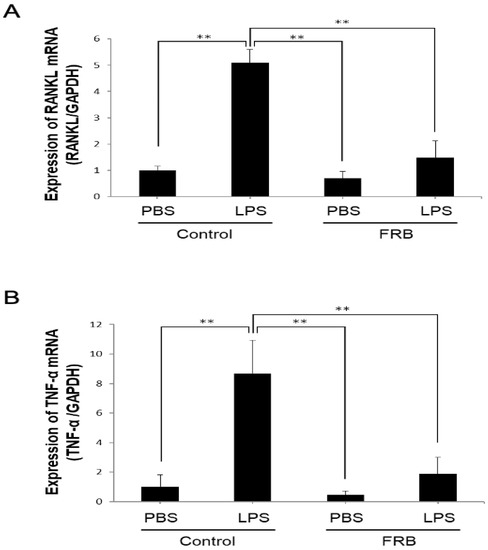 Macrophages, one of the immune cells, are also factors that promote osteoclast differentiation by producing TNF-α upon LPS stimulation [43,44]. To further investigate how FRB inhibits LPS-induced osteoclastogenesis in vivo, we examined whether FRB inhibits LPS-induced TNF-α expression in macrophages in vitro. The real-time RT-PCR results showed that TNF-α mRNA expression was increased by LPS treatment, but LPS-induced TNF-α expression was decreased by FRB extract treatment (Figure 7). FRB may have an inhibitory effect on TNF-α expression in LPS-stimulated macrophages.