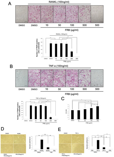 Bone marrow cells were obtained from the isolated femur and tibia of male 8–10-week-old mice. The cells were cultured in α-MEM (Sigma Aldrich, St. Louis, MO, USA) supplemented with 10% fetal bovine serum (FBS), 1% antibiotics (penicillin, streptomycin) (Meiji Seika, Tokyo, Japan) and M-CSF (100 ng/mL). Three days later, adherent cells were harvested using trypsin-EDTA solution (Sigma Aldrich) and defined as osteoclast precursors. Harvested cells were seeded in a 96-well plate (5 × 104 cells/well) and cultured in medium containing M-CSF (100 ng/mL) with 0.5% DMSO or FRB extract (500 μg/mL), M-CSF (100 ng/mL) and RANKL (100 ng/mL) or TNF-α (100 ng/mL) with 0.5% DMSO or different concentrations of FRB extract (10, 50, 100 and 500 μg/mL). DMSO was used as a control vehicle. After 5 days, cultured cells were fixed with 10% formalin solution, permeabilized with 0.2% Triton X-100, and stained by TRAP. TRAP-positive multinucleated cells (≥3 nuclei) were counted after imaging under an optical microscope [41]. Osteoclast precursors were cultured on Osteo Assay Plate 96 Well (Corning Life Sciences, Corning, NY, USA) for resorption pits assay. After 5 days, pit formation was evaluated [41]. Data were expressed as resorption pits area per total surface area.