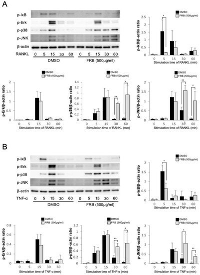 Effect of FRB extract on IκB and MAPKs (Erk, P38, and JNK) phosphorylation in RANKL or TNF-α induced osteoclast precursors. (A) Osteoclast precursors were treated with RANKL in the presence of 0.5% DMSO (control vehicle) or FRB extract (500 µg/mL) for the indicated times. Phosphorylated IκB and MAPKs (Erk, JNK, and P38) were detected with Western blotting. The band intensity ratios of phosphorylated IκB and MAPKs (Erk, JNK, and P38) to β-actin were quantified, respectively. (B) Osteoclast precursors were treated with TNF-α in the presence of 0.5% DMSO (control vehicle) or FRB extract (500 µg/mL) for the indicated times. After the cells were lysed, Western blot analysis was performed using specific antibodies. The band intensity ratios of phosphorylated IκB and MAPKs (Erk, JNK, and P38) to β-actin were quantified, respectively. n = 3. Results are means ± SD. Significant differences between the two groups (control group and FRB extract treated group) are indicated as * p < 0.05, ** p < 0.01 using Student’s t-test.