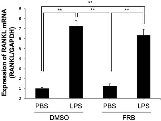 Osteoblasts have been shown to be involved in osteoclastogenesis through increased RANKL expression upon LPS stimulation [43,44]. We analyzed the mRNA expression levels of RANKL in osteoblasts induced by LPS to determine the mechanism of the inhibitory effect of FRB in vitro. The mRNA expression level of RANKL was increased in both groups treated with LPS with or without FRB extract. However, there was no significant difference in RANKL expression between the FRB extract treatment or non-treatment osteoblasts (Figure 6). FRB may not be involved in RANKL expression in LPS-stimulated osteoblasts.
