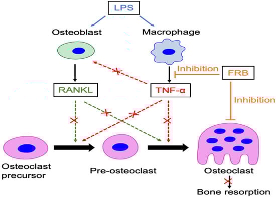 Schematic of the inhibitory mechanism of FRB supplementation on LPS-induced osteoclastogenesis and bone resorption. These effects may be involved in the suppression of osteoclast formation caused by the osteoclast-related cytokines RANKL and TNF-α and the suppression of TNF-α production in macrophages caused by LPS. Furthermore, although FRB has no direct effect on RANKL expression in osteoblasts during LPS stimulation, it may indirectly suppress RANKL expression in osteoblasts by inhibiting TNF-α production by macrophages. FRB directly and indirectly may inhibit osteoclast formation and bone resorption induced by LPS in vivo.