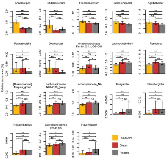 Bacterial genera selected from Random Forest modelling for FODMAP-related models (i.e., FODMAPs vs. placebo, FODMAPs vs. washout and FODMAPs vs. gluten). Genera (relative abundance (%)) differing between the interventions of FODMAPs, gluten and placebo in mixed models are presented (n = 100). Data presented as estimated marginal means and 95% confidence interval. The top row in each graph represents the overall p-value, while the others present pairwise comparisons. p-values are presented with the star system: * = p < 0.05, ** = p < 0.01, *** = p < 0.001. The figure is reproduced from []. Abbreviation: FODMAPs, fermentable oligosaccharides, disaccharides, monosaccharides, and polyols; ns: non significant.