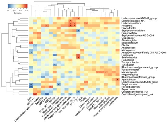 Partial Spearman correlation between bacterial genera selected from Random Forest modelling for FODMAP-related models (FODMAPs vs. placebo, FODMAPs-washout and FODMAPs vs. gluten) and the questionnaires IBS-SSS, Short Form 36 version 2 (health and quality of life) and the bowel diary, adjusted for age and sex (n = 100). The figure is reproduced from []. p-values are presented with the asterisk system: * = p < 0.05, ** = p < 0.01. Abbreviations: BM, Bowel movements; BSFS, Bristol Stool Form Scale; FODMAPs, fermentable oligosaccharides, disaccharides, monosaccharides, and polyols; IBS-SSS, Irritable Bowel Syndrome Severity Scoring System; SBMs, spontaneous bowel movement; SCBMs, spontaneous complete (a sensation of complete evacuation) bowel movement; Pain, abdominal pain linked to bowel emptying.