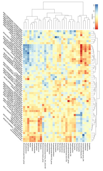 Partial Spearman correlation between genera selected from Random Forest modelling for FODMAP-related models (i.e., FODMAPs vs. placebo, FODMAPs vs. washout and FODMAPs vs. gluten) and metabolites selected from FODMAP vs. placebo, adjusted for age and sex (n = 99). p-values are presented with the asterisk system: * = p < 0.05, ** = p < 0.01, *** = p < 0.001. The figure is reproduced from []. Abbreviation: FODMAPs, fermentable oligosaccharides, disaccharides, monosaccharides, and polyols.