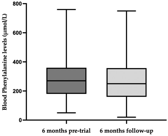 The blood phenylalanine levels pre-baseline and during the 6-month extension study are given in Figure 2. There was no statistically significant difference in the blood phenylalanine control for 6 months pre-baseline (median, 270 μmol/L, range: 50–760) compared with the 6-month extension period (median, 250 μmol/L, range: 20–750), p = 0.4867.