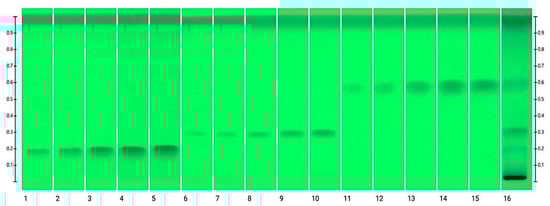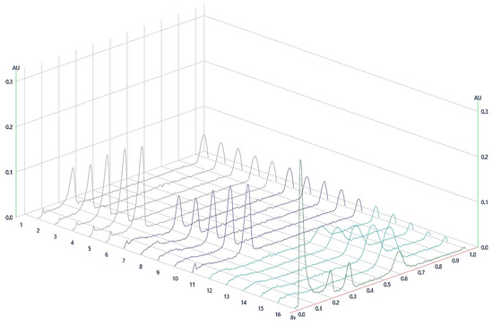 Profiles of different concentration levels of the standard solutions of PDs and RCE, where 1. TU 0.5 μg·band−1; 2. TU 0.75 μg·band−1; 3. TU 1 μg·band−1; 4. TU 1.25 μg·band−1; 5. TU 1.5 μg·band−1; 6. 20E 0.5 μg·band−1; 7. 20E 0.75 μg·band−1; 8. 20E 1 μg·band−1; 9. 20E 1.25 μg·band−1; 10. 20E 1.5 μg·band−1; 11. PA 0.5 μg·band−1; 12. PA 0.75 μg·band−1; 13. PA 1 μg·band−1; 14. PA 1.25 μg·band−1; 15. PA 1.5 μg·band−1; 16. RCE.