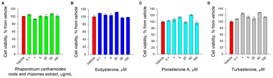 Cell viability was not affected upon RCE, 20E, PA, and TU treatment. Cell viability, expressed as the percentage of cell viability compared to the vehicle as the mean ± SEM upon treatment with (A) RCE, (B) 20E, (C) PA, and (D) TU.