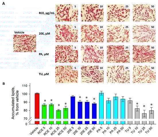 The results of total lipid quantification (Figure 5B) revealed a statistically significant reduction upon the administration of the following treatments—RCE (86.8, 87.1, 80.2, and 82.8% for 5, 10, 25 and 50 μg·mL−1, respectively), 20E (97, 90.4, 90.2, and 88.3% for 5, 10, 25 and 50 μM, respectively), and TU (91.9, 82.3, 76, and 79.9% for 5, 10, 25 and 50 μM, respectively). Among the investigated treatments, the highest anti-adipogenic activity was observed for TU, followed by RCE and 20E. In the current experiment, PA did not affect adipogenic differentiation in human adipocytes.