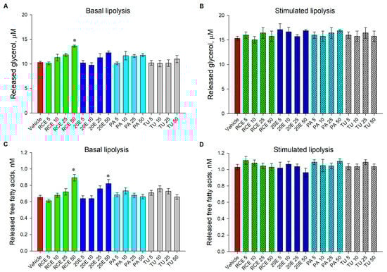 Incubation with RCE (50 μg·mL−1) significantly increased the concentration of both glycerol (Figure 6A) and FFAs (Figure 6C) in the culture media under basal conditions. In a similar manner, in unstimulated adipocytes, 20E (50 μM) application only significantly increased the FFA concentration (Figure 6C). Treatment with PA and TU affected neither glycerol (Figure 6A) nor FFA (Figure 6C) concentrations. Therefore, we can suggest that both RCE and 20E significantly increased basal lipolysis, while such an effect was not observed upon PA or TU treatment (Figure 6A,C). Isoproterenol stimulation elevated the released glycerol and FFAs in comparison to the basal level. However, no significant effect on both glycerol (Figure 6B) and FFAs (Figure 6D) was detected upon all the treatments applied compared to the isoproterenol-stimulated vehicle.