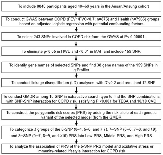FEV1, forced expiratory volume in 1 s; FVC, forced vital capacity; GOLD, Global Initiative for Chronic Obstructive Lung Disease; COPD, Chronic obstructive pulmonary disease; BMI, body mass index; SQFFQ, semi-quantitative food frequency questionnaire; GWAS, Genome-wide association studies; GMDR, generalized multifactor dimensionality reduction; Q–Q, Quantile–Quantile; SNPs, single nucleotide polymorphisms; LD, linkage disequilibrium; PRS, polygenic risk score; CVC, cross-validation consistency; TRBA, trained balance accuracy; TEBA, test balance accuracy; ORs, odds ratios; CI, confidence interval; ANOVA, analysis of variance; GLM, general linear model; DRI, dietary reference intake; CRP, C-reactive protein.