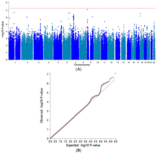 Genetic variant distribution for COPD risk in a genome-wide association study. (A) Manhattan plot of the p-value of genetic variants. The red dotted line indicates the p-value of the cutoff of genetic variants for the COPD risk (B) Q–Q plot of observed and expected p-values. The red dotted line indicated the calculated observed and expected p-value. It indicates the perfect matching between observed and expected p-values.