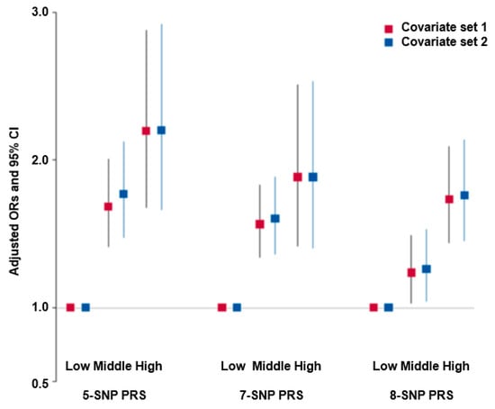 Adjusted odds ratio (ORs) and 95% confidence intervals (CI) of the 5-, 7-, and 8-SNP PRS for COPD risk. PRS was generated with the sum of the number of risk alleles in each SNP and was classified into low-PRS, middle-PRS, and high-PRS according to the ranges of ≤4, 5–6, and ≥7 in the five-SNP model, 0–6, 7–8, and ≥9 in the seven-SNP model, and 0–7, 8–9, and ≥10, respectively. The covariates of set 1 were age, gender, body mass index, education, income, and residence area. Group 2 included those in set 1 plus energy intake, work-related chemicals and dust, asthma medication, exercise, alcohol drinking, and smoking.