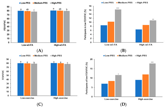 FEV1/FVC of participants with low, middle, or high polygenic risk scores (PRSs) as determined using the 5-SNP model according to w-3 fatty acid intake and exercise. (A) Adjusted means and standard errors of forced expiratory volume in 1 s (FEV1)/forced vital capacity (FVC) in the PRS categories by w3-fatty acid intake (a cutoff value: 0.7 En%). (B) Incidence of COPD according to the PRS categories by w3-fatty acid intake (a cutoff value: 0.7 En%). (C) Adjusted means and standard errors of the FEV1/FVC in the PRS categories by moderate-intensity exercise (a cutoff value: moderate-intensity exercise for 150 min/week). (D) Incidence of COPD according to the PRS categories in low and high exercise categorized by moderate-intensity exercise (a cutoff value: moderate-intensity exercise for 150 min/week). PRS was generated as the sum of the number of risk alleles in each SNP, and it was classified as low-PRS, middle-PRS, and high-PRS according to the range ≤4, 5–6, and ≥7, respectively, in the five-SNP model. Covariates included age, gender, education, income, energy intake (percentage of estimated energy requirement), job/occupation with exposure to dust/chemicals, residence area, regular exercise, alcohol intake, and smoking status. * Significantly different between low and high-PRSs at p < 0.05, ** at p < 0.01, and *** at p < 0.001. a,b,c Different letters on the bar indicated significant differences among the groups in Tukey’s test at p < 0.05.