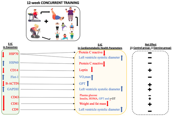 Direction of the exercise-induced changes in exosomes and cardiometabolic health parameters for obese participants in the concurrent training group (n = 5). The red and blue colors indicate decreased and increased values after 12 weeks, respectively. Net effect showed the positive or negative sign of differences between changes in the control group minus changes in the exercise group. Negative implies a higher absolute change in the exercise versus control group, while positive means a smaller change in the exercise versus control group. Arrows indicate the relationships found between changes in exosomes and changes in cardiometabolic parameters after 12 weeks in the total sample (n = 9).