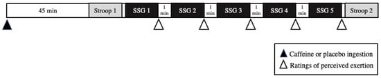 A crossover randomized double-blind placebo-controlled trial was used in the current study. Two weeks after the familiarization session, participants performed an SSG exercise protocol after the ingestion of caffeine (5 mg.kg−1) or placebo solutions. Seven days later, the SSG protocol was repeated, totalling two experimental sessions using a placebo or caffeine in a randomized manner. Cognitive performance was assessed by the Stroop test 45 min after caffeine or placebo ingestion and immediately after the exercise protocol. The experimental design is illustrated in Figure 1.