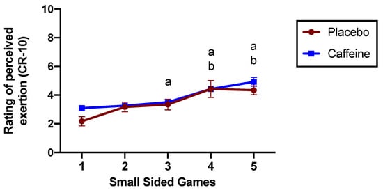 Rating of perceived exertion during 5 small-sided games in placebo and caffeine condition. Condition (placebo vs. caffeine) main effect: p = 0.23; SSG protocol main effect: p < 0.001; Interaction main effect: p = 0.23. Tukey’s multiple comparisons test: a = p < 0.05 vs. SSG 1 within placebo condition; b = p < 0.05 vs. SSG 1 within caffeine condition.