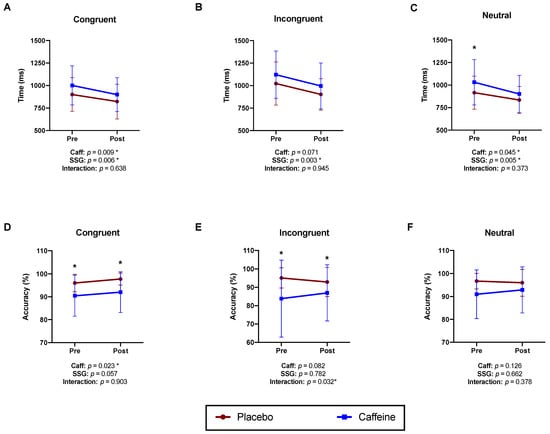 Stroop test performance before and after 5 small-sided games in Placebo and Caffeine conditions. Stroop test response time in congruent (A), incongruent (B) and neutral (C) conditions. Stroop test accuracy in congruent (D), incongruent (E) and neutral (F) conditions. Tukey’s multiple comparisons test: * = p < 0.05 caffeine vs. placebo within the same time point.