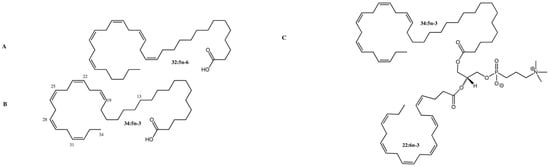 Structure of C32 and C34 VLC-PUFAs in the human retina. (A) C32:5 n-6 VLC-PUFA; (B) C34:5 n-3 VLC-PUFA; (C) Phosphatidylcholine containing C34:5 n-3 VLC-PUFA (sn-1) and DHA (sn-2). Methylene-interrupted cis double bonds are located on the distal ends of VLC-PUFAs, while the proximal ends are reminiscent of saturated fatty acids. Images adapted from Gorusupudi et al. [8] with authors’ permission.
