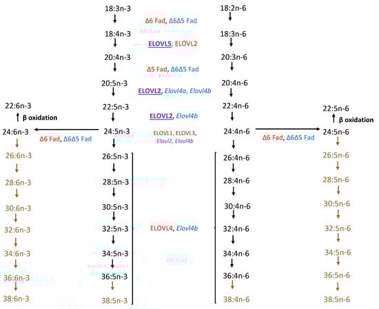 Comparison of biosynthetic pathway of VLC-PUFAs from linoleic (18:2 n-6) and α-linolenic (18:3 n-3) acid precursors of zebrafish and mammalian vertebrates (adapted from Monroig et al. [9] and Hopiavuori et al. [10]). Color Key: Red: Mammalian (human and murine); Blue: Zebrafish; Purple: Both; Brown: Pathway presumed but not confirmed in zebrafish.