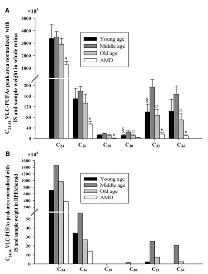 C24-C34 VLC-PUFA comparison in lipids extracted from whole retinas (A) and RPE/choroidal tissue (B) obtained for normal young, middle-aged, and old individuals and age-matched patients with AMD. This image shows that patients with AMD had significantly lower retinal C24, C26, C28, C32, and C34 VLC-PUFAs than age-matched controls. Moreover, VLC-PUFAs were also reduced in the RPE/choroid of patients with AMD. §, Significant differences (p < 0.05) between young and middle age group; ¤, means significant differences (p < 0.05) between middle and old age group; *, significant differences (p < 0.05) between old and age-matched AMD group. In (B), there are no statistics provided, because each group’s samples had to be pooled. IS: internal standard. Image obtained from Liu et al. [16] with authors’ permission.