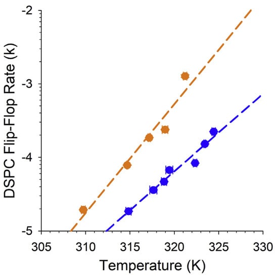 VLC-PUFAs increase lipid flip-flop in synthetic bilayers. Comparison of the changes in deuterium-labeled distearoylphosphatidylcholine (DSPC) flip-flop rate (k) with increasing temperature in synthetic DSPC lipid bilayers supplemented with 0.1% C32:6 n-3 VLC-PUFA (yellow) and non-supplemented (blue) DSPC bilayer. Image obtained from Cheng et al. [52] with permission.