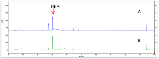High-performance liquid chromatogram of HEA-enriched C. cicadae mycelial extracts (A) HPLC chromatogram of the C. cicadae mycelial water extract. (B) HPLC chromatogram of the C. cicadae mycelial water extract.