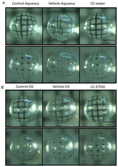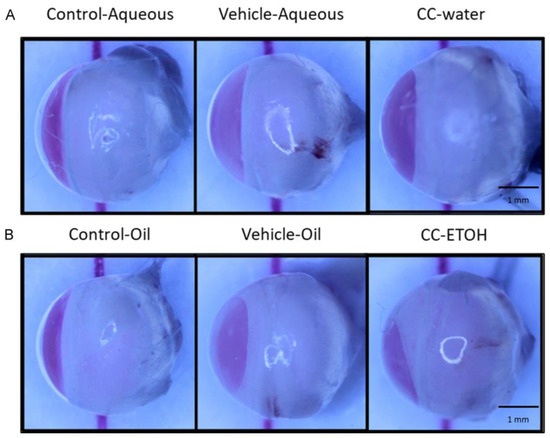 Crystal lens images of ICR mice. (A) Representative images of crystal lenses from aqueous group. (B) Representative images of crystal lenses from oil group. Scale bar = 1 mm. CC-water: C. cicadae mycelial water extract; CC-ETOH: C. cicadae mycelial ethanol extract.