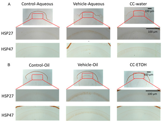 C. cicadae suppresses HSP27 and HSP47 expression in the cortex. (A) Representative images of Hsp 27 and Hsp 47 staining from aqueous group. (B) Representative images of Hsp 27 and Hsp 47 staining from oil group. Scale bar = 100 µm. CC-water: C. cicadae mycelial water extract; CC-ETOH: C. cicadae mycelial ethanol extract; HSP27: heat-shock protein 27; HSP47: heat-shock protein 47.