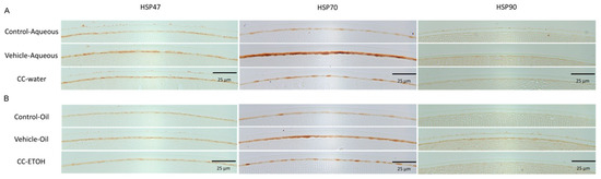 C. cicadae decreases HSP47, HSP70, and HSP90 expression in hLECs. (A) Representative images of Hsp 47, Hsp 70, and Hsp 90 staining from aqueous group. (B) Representative images of Hsp 47, Hsp 70, and Hsp 90 staining from oil group. Scale bar = 25 μm. CC-water: C. cicadae mycelial water extract; CC-ETOH: C. cicadae mycelial ethanol extract; HSP47: heat-shock protein 47; HSP70: heat-shock protein 70; HSP90: heat-shock protein 90.