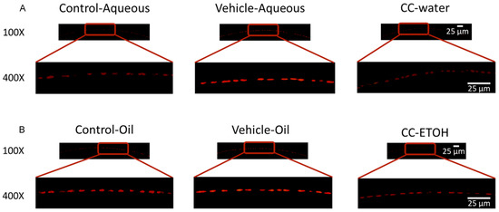 In this experiment, the side view of the lenses was examined. The degree of lens opacity and transparency was directly observed by comparing the shade of red in each group. No abnormalities were observed in the lenses of undamaged control groups (Control-Aqueous and Control-Oil) (Figure 3A,B) as the red color was most intense, whereas significant opacity was seen in the lenses of damaged groups treated solely with solvent (Vehicle-Aqueous and Vehicle-Oil) which showed a lighter shade of red. Thus, the UVB induction of cataract symptoms was confirmed. In samples of C. cicadae mycelial water extract and C. cicadae mycelial ethanol extract, the red color was markedly more intense than in the damage groups and comparable to that of the blank groups, indicating a lesser degree of lens opacity progression and better transparency.