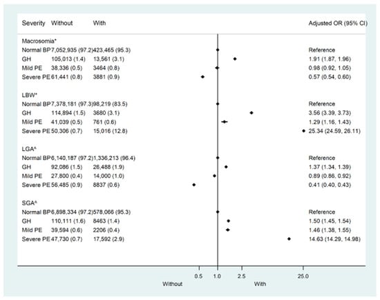 Risk of adverse outcomes by the severity of pregnant hypertensive disorders in the China Labor and Delivery Survey (CLAD). LBW—Low birth weight; LGA—Large for gestational age; SGA—Small for gestational age. * Adjusted for maternal age, race, sex, education, parity, pre-pregnancy body mass index (BMI), heart disease, renal disease, thyroid disease, diabetes mellitus, gestational diabetes, and gestational age. ^ Adjusted for maternal age, race, education, parity, pre-pregnancy body mass index (BMI), heart disease, renal disease, thyroid disease, diabetes mellitus, and gestational diabetes.