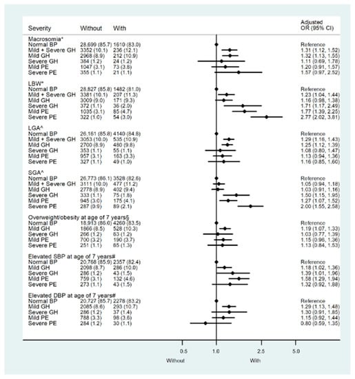 Risk of adverse outcomes by the severity of pregnant hypertensive disorders in the Collaborative Perinatal Project (CPP). LBW: Low birth weight; LGA: Large for gestational age; SGA: Small for gestational age; Elevated SBP: Systolic blood pressure at 7 years of age higher than 125 mmHg, the 90th percentile within the CPP population. Elevated DBP: Diastolic blood pressure at 7 years of age higher than 70 mmHg, the 90th percentile within the CPP population. Overweight/obesity: Race- and sex-specific body mass index at 7 years of age higher than the 85th percentile within the CPP population. GH—Gestational hypertension. Mild PE—mild preeclampsia. Severe PE—Severe preeclampsia/eclampsia. Model *: Adjusted for maternal age, parity, race, sex, maternal education level, marital status, smoking status during pregnancy, socioeconomic status, diabetes, maternal pre-pregnancy body mass index (BMI), gestational weight gain, and gestational age. Model ^: maternal age, parity, race, maternal education level, marital status, smoking status during pregnancy, socioeconomic status, diabetes, maternal pre-pregnancy body mass index (BMI), and gestational weight gain. Model §: Model * + birth weight. Model #: Model * + birth weight and body mass index at 7 years of age.