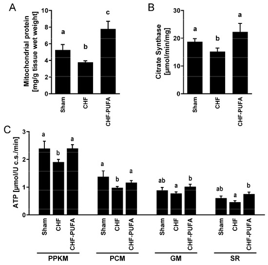 Muscle mitochondrial function. Impact of 8 week isocaloric, isolipidic n-3 PUFA-enriched diet in a mouse model after myocardial infarction-induced chronic heart failure (CHF) on left gastrocnemius (A) mitochondrial protein content, (B) citrate synthase activity, and (C) ATP synthesis rate in intact isolated mitochondria with different respiratory substrates (PPKM: Pyruvate+Palmitoyl-L-Carnintine+α-Ketoglutarate+Malate; PCM: Palmitoyl-L-Carnintine+Malate; GM: Glutamate+Malate; SR: Succinate+Rotenone) compared to chronic heart failure on standard diet (CHF) and to sham-operated animals (Sham). p < 0.05 among groups not sharing a letter, mean ± SEM, n = 8/group.