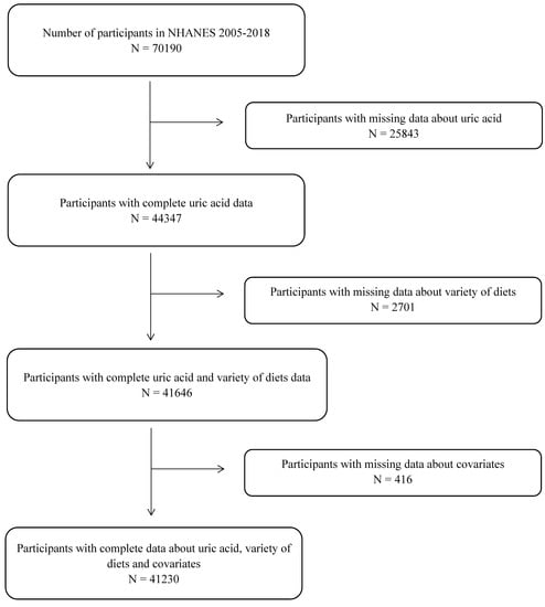 Data for older adults 18 years or more from the 2005–2018 NHANES and the corresponding FPED version 2005–2018 were used for this study. Excluding those lacking serum UA information and those lacking study factors and covariates, ultimately a total of 41,230 participants were included (Figure 1). Institutional review board approval of the National Center for Health Statistics and written informed consent were obtained prior to data collection.