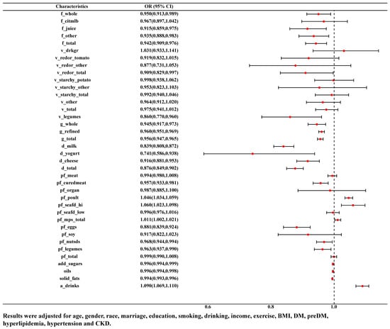 The association between food groups and HUA was examined by binary logistic model. As was shown in Figure 2, after adjusting for age, gender, race, marriage, education, smoking, drinking, income, exercise, BMI, DM, pre-DM, hyperlipidemia, hypertension and CKD, the consumption of citrus, melon and berry fruits was negatively correlated with HUA (OR = 0.942, 95% CI: 0.909–0.976), whether in whole fruit (OR = 0.950, 95% CI: 0.913–0.989), juice (OR = 0.915, 95% CI: 0.859–0.975) or other forms (OR = 0.935, 95% CI: 0.888–0.983). Consumption of red and orange vegetables (OR = 0.909, 95% CI: 0.829–0.997) as well as legume vegetable (OR = 0.860, 95% CI: 0.770–0.960) and grains (either whole grains (OR = 0.945, 95% CI: 0.917–0.973) or refined grains (OR = 0.960, 95% CI: 0.951–0.969)) were negatively correlated with HUA. Consumption of more dairy products (whether milk (OR = 0.839, 95% CI: 0.808–0.872), yoghurt (OR = 0.741, 95% CI: 0.586–0.938), cheese (OR = 0.916, 95% CI: 0.881–0.953) or combination (OR = 0.876, 95% CI: 0.849–0.902)) and other protein-rich foods (cured meats (OR = 0.957, 95% CI: 0.933–0.981), eggs (OR = 0.881, 95% CI: 0.839–0.924), beans and peas (OR = 0.963, 95% CI: 0.937–0.990), nuts and seeds (OR = 0.968, 95% CI: 0.944–0.994)) was negatively correlated with HUA. However, more poultry meat (OR = 1.046, 95% CI: 1.034–1.059), seafood rich in n-3 fatty acids (OR = 1.060, 95% CI: 1.023–1.098), alcohol (OR = 1.090, 95% CI: 1.069–1.110) were positively correlated with HUA.