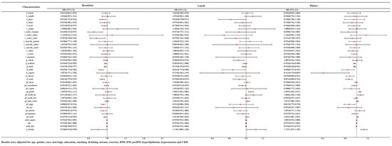 In NHANES, staff have divided the food into multiple time periods of intake based on the timing of the food intake. We selected seven NHANES cycles in which people with food intake at breakfast/lunch/dinner were individually subjected to logistic regression to understand the relationship between food groups and HUA at different eating times. Saw the Supplementary Tables S2–S4 for the baseline data for people corresponding to each time period. The association between food groups and HUA at different eating times was displayed in Figure 3. After adjusting for age, gender, race, marriage, education, smoking, drinking, income, exercise, BMI, DM, pre-DM, hyperlipidemia, hypertension and CKD, we found that juice (OR = 0.873, 95% CI: 0.792–0.962), milk (OR = 0.835, 95% CI: 0.773–0.902), tomatoes (OR = 0.645, 95% CI: 0.473–0.879) and red orange vegetables (OR = 0.707, 95% CI: 0.528–0.945), refined grains (OR = 0.954, 95% CI: 0.924–0.985) and eggs (OR = 0.888, 95% CI: 0.837–0.942) at breakfast, whole grains (OR = 0.908, 95% CI: 0.845–0.976), juice (OR = 0.818, 95% CI: 0.670–0.997) and cured meats (OR = 0.953, 95% CI: 0.913–0.995) at lunch, refined grains (OR = 0.962, 95% CI: 0.944–0.980), eggs (OR = 0.867, 95% CI: 0.775–0.970) and dairy products of any kind (milk (OR = 0.840, 95% CI: 0.737–0.956), yogurt (OR = 0.411, 95% CI: 0.194–0.869), and cheeses (OR = 0.878, 95% CI: 0.809–0.952)) at dinner were negatively correlated with HUA. At the same time, eating poultry at lunch (OR = 1.056, 95% CI: 1.026–1.086) or dinner (OR = 1.055, 95% CI: 1.033–1.077) and seafood rich in n-3 fatty acids (OR = 1.068, 95% CI: 1.018–1.120) at dinner were deemed to be positively correlated with HUA. Interestingly, the consumption of alcohol at breakfast (OR = 0.748, 95% CI: 0.564–0.990) was negatively correlated with HUA, but positively correlated with HUA at lunch (OR = 1.118, 95% CI: 1.008–1.240) and dinner (OR = 1.127, 95% CI: 1.073–1.185).