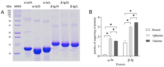 The SDS-PAGE analysis and an analysis of the amount of sugar bonded to proteins were performed on samples heated with and without sugar (heated and glycated) (Figure 1A,B). The protein bands of the thermally treated (α-la/H) and glycated (α-la/G and α-la/L) α-la samples showed a migration rate corresponding to a molecular weight of 14 kDa (Figure 1A).