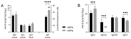 Humoral response against β–lactoglobulin on the 26th day of the experiment. (A) Specific IgG and IgA and total IgE titers; (B) specific IgG subclasses (IgG1, IgG2a, IgG2b, and IgG3). Mice were immunized intragastrically (i-g) and intraperitoneally (i-p) with β-lg. Results are presented as the means of each group (n = 8) ± SD. Statistical differences are denoted in the following manner: *** p < 0.001; **** p < 0.0001; nd—not detected.