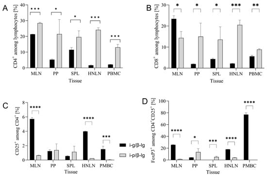 T cell profiles in tissues of mice immunized with β-lactoglobulin (β-lg) via intragastric (i-g) and intraperitoneal (i-p) routes: (A) CD4+, (B) CD8+, (C) CD4+CD25+, and (D) CD4+CD25+FoxP3+ lymphocytes in mesenteric lymph nodes (MLN), Peyer patches (PP), spleen (SPL), head and neck lymph nodes (HNLN), and peripheral blood mononuclear cells (PMBC). Results are presented as the means of the groups (n = 8) ± SD. Statistical differences between groups are denoted in the following manner: * p < 0.05; ** p < 0.01; *** p < 0.001; **** p < 0.0001.