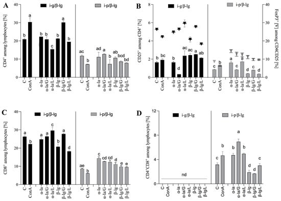 Mesenteric lymph nodes’ T lymphocyte profiles. (A) CD4+, (B) CD4+CD25+, and CD4+FoxP3. (C) CD8+, and (D) CD4+CD8+ populations. Cells were stimulated with α-lactalbumin (α-la) and β-lactoglobulin (β-lg), and after glycation, antigens with glucose (α-la/G; β-lg/G) or lactose (α-la/L; β-lg/L), cells grown in medium only (C) and stimulated with Concanavalin A served as controls (10 μg/mL) (ConA). Lymphocytes were isolated from mice (n = 8) immunized with β-lg intragastrically (black bars) or intraperitoneally (grey bars). Results are presented as the means of the groups ± SD. Different superscript letters denote statistically significant differences (p < 0.05).