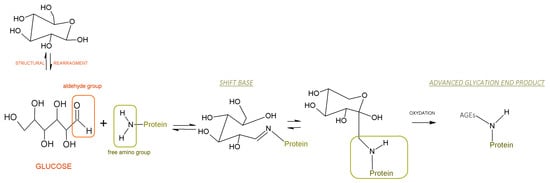 Under homeostatic conditions, AGEs are found in low concentrations, and the body removes them via degradation in proteasomes. Raubach et al. [] demonstrated that the glycation conditions of myoglobin (such as varying glucose concentrations) affected its proteasomal degradation. The accumulation of AGE in tissues is associated with a number of processes (e.g., glycation increases the stiffness of collagen fibers), the development of cardiovascular diseases (high levels of blood glucose increase the frequency with which blood glucose binds to proteins such as hemoglobin or low-density lipoprotein (LDL)), the development of metabolic disorders, diabetes and Alzheimer’s disease (via the degradation of some brain proteins), and kidney diseases [,].