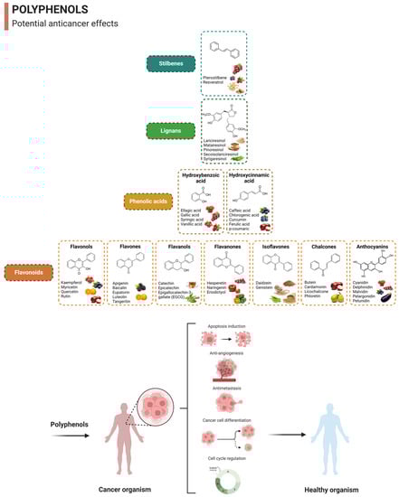 | Polyphenol | Main Class/ Sub-Class | Food Source | Type of Cancer | Therapeutic Effects on Cancer Cells | References |