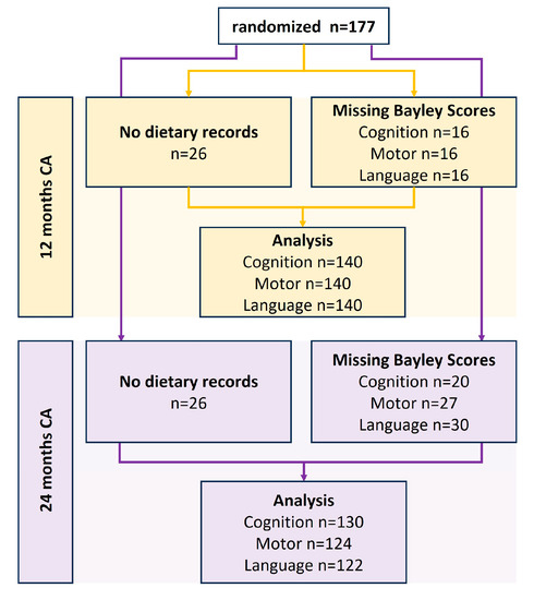 Out of the 177 patients that were randomized, neurodevelopmental outcome data at 12 months CA and at least one dietary record were available for analysis in 140 patients, accounting for 79% of the total sample size (Figure 1). A total of 1100 valid 3-day dietary records were included in this analysis.