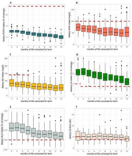 Dietary fatty acid intake from 3 to 12 months of life CA in comparison with dietary intake recommendations. (A) Polyunsaturated fatty acid (PUFA) in % of energy, (B) docosahexaenoic acid (DHA) in mg/d, (C) arachidonic acid (AA) in mg/d, (D) linoleic acid (LA) in % of energy, (E) alpha-linolenic acid (ALA) in % of energy, and (F) LA/ALA ratio. The red line represents the dietary intake recommendation for the distinct nutrient.