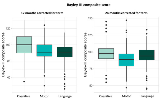 Results of Bayley-III assessment are shown in Figure 3. Median cognitive composite score at 12 months CA was 100 (IQR: 80–120, n = 140) and 97.5 (IQR: 82.5–112.5, n = 130) at 24 CA. Median motor composite score at 12 months CA increased from 91 (IQR: 79–103, n = 140) to 94 (IQR: 79–109, n = 124) at 24 months CA. At 12 months CA, median language score was 91 (IQR: 77–105, n = 140) and decreased to 89 (IQR: 71–106, n = 122) at 24 months CA.