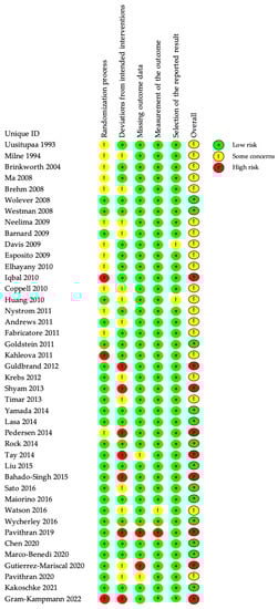 Risk of bias summary: Review authors’ judgements about each risk of bias item for each included study. Data from references [,,,,,,,,,,,,,,,,,,,,,,,,,,,,,,,,,,,,,,,,,].