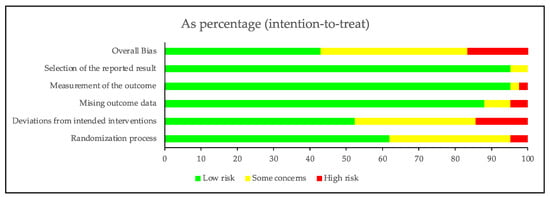 All included studies were assessed by two authors independently and simultaneously. The results of the RoB analysis are summarized in Figure 2 and Figure 3. The overall risk of bias was rated as high for 7 (16.7%) studies and low for 18 (42.9%) studies. Among the five types of risk assessed, namely randomization process, deviations from intended intervention(s), missing outcome data, outcome measurement, and selection of the reported result, the first two types were the major risks of bias in the included studies. Studies were deemed somehow risky in the randomization process if the report of which lacked details or was indicative of failing double-blindness. Deviation from the intended intervention was considered mainly for the blinding of assessors or analysts and the potential deviation because of experimental contexts. Concerning the missing outcome data domain, most studies probably had data for all of, or nearly all of, the randomized participants, while for those that were considered some concern or high risk of bias, either important percentages of subjects that dropped out were found, or no information about missing data was reported. We have considered a drop-out rate of ≤10% as one of our criteria. Outcome measurement was considered lower in risk for most of the studies, as it was conducted by third-parties other than the researchers, except for one study [], in which one resulted in limited information and the other did not describe the measurement. And two studies [,] were deemed medium risky in the selection of the reported result because of the absence of a prespecified trial protocol, so we assessed this domain as “some concerns”. Finally, it was noteworthy that the overall risk of bias was adjusted for studies only deemed risky in blinding [,,,,,,], as the dietary intervention was naturally difficult to keep blinded to both patients and care-givers.