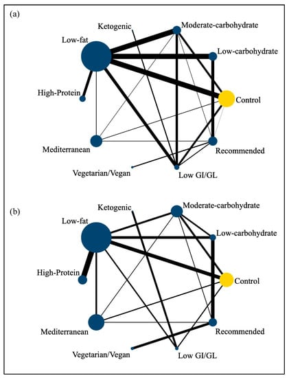 Network diagrams for direct comparison for HbA1c (panel (a)) and fasting glucose (panel (b)). The size of the nodes was proportional to the sample size of each dietary intervention and the thickness of the lines was proportional to the number of studies available.